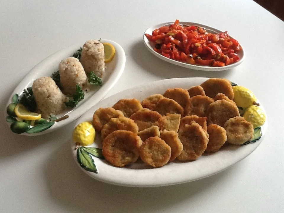 Breaded eggplants with rice and vegetable side dish