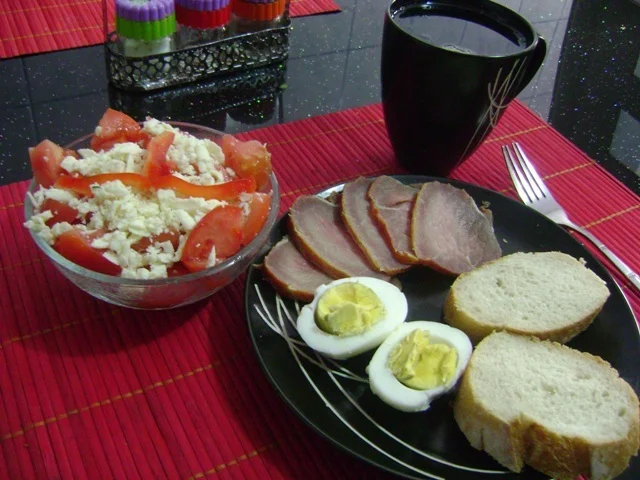 Breakfast for Champions: Boiled Egg with Pork Tenderloin, Tomato Salad, and Green Tea