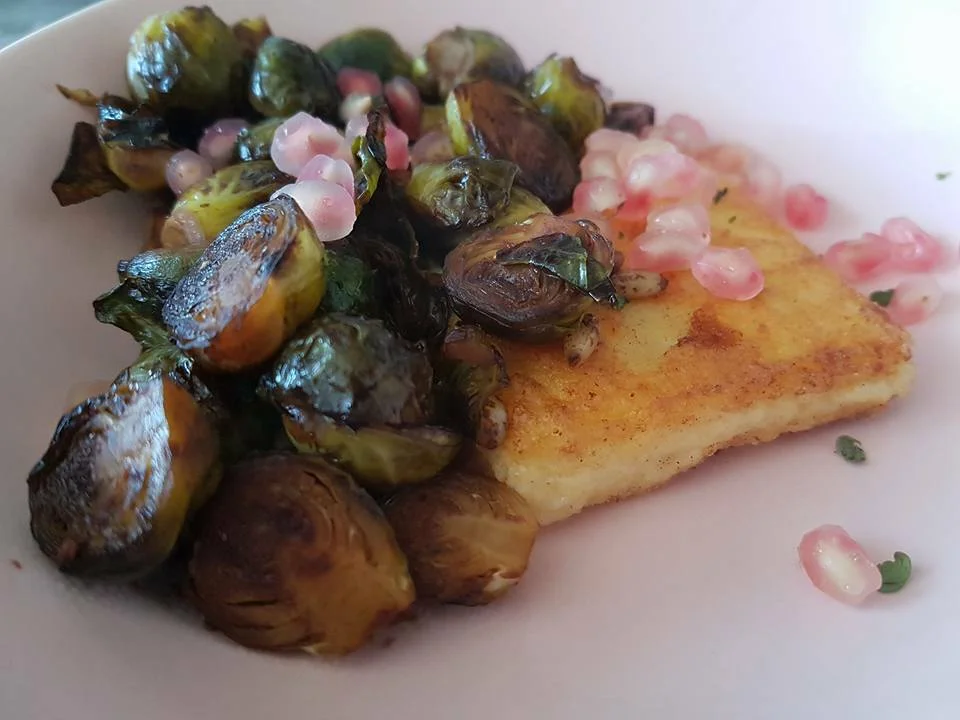Breaded polenta with Brussels sprouts glazed with balsamic vinegar and pomegranate seeds
