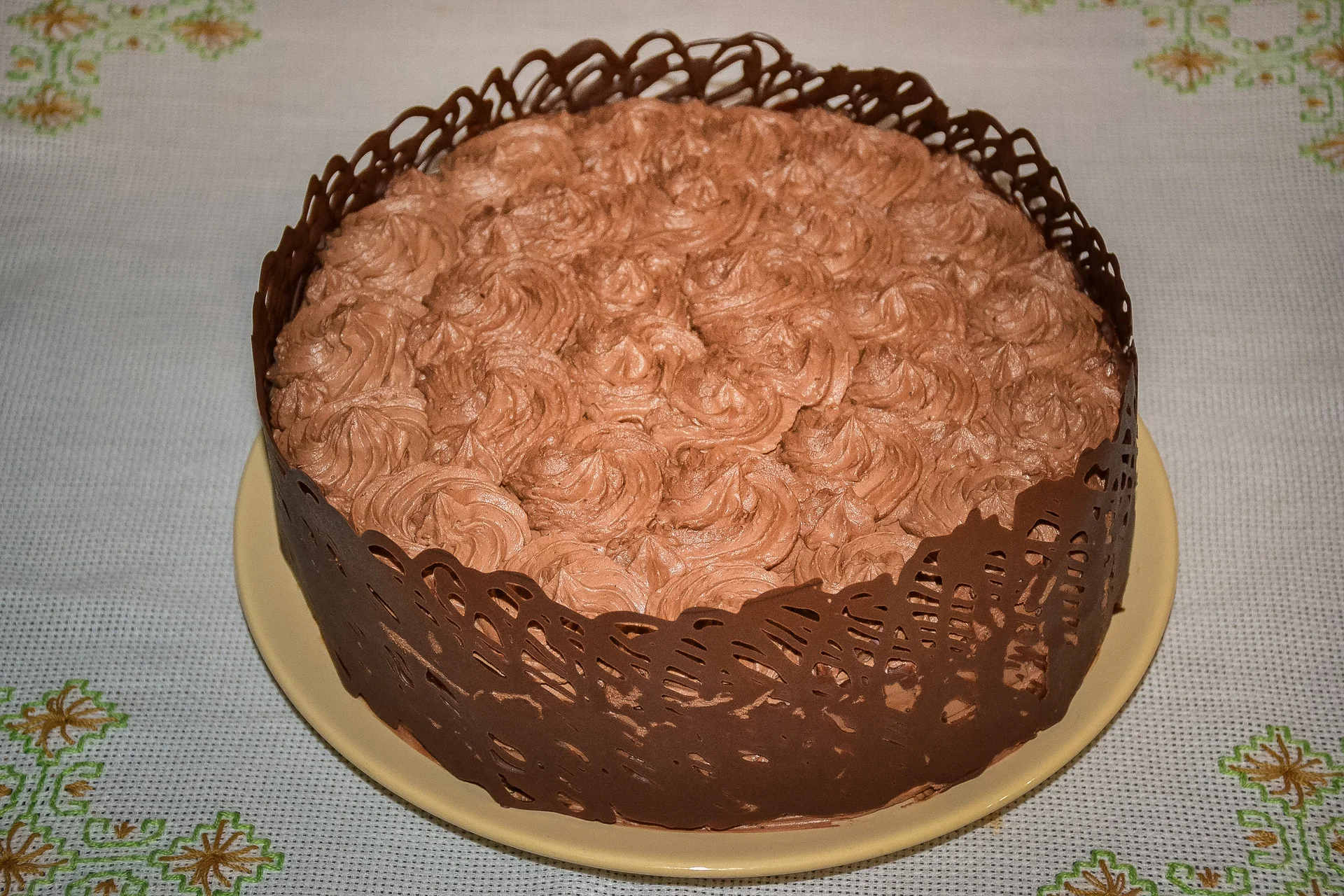 Chocolate cake with peach cream and chocolate lattice