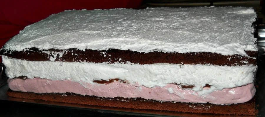 Plum mousse cake, cottage cheese, and whipped cream