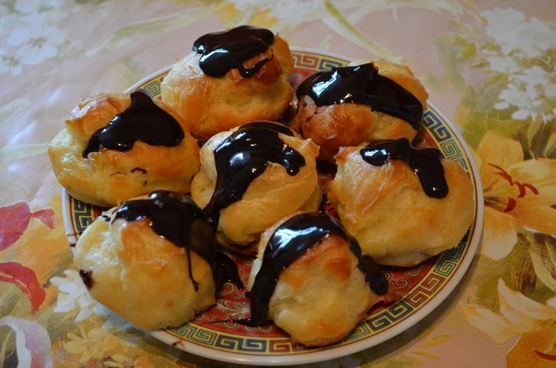 Profiterole with vanilla cream and chocolate glaze