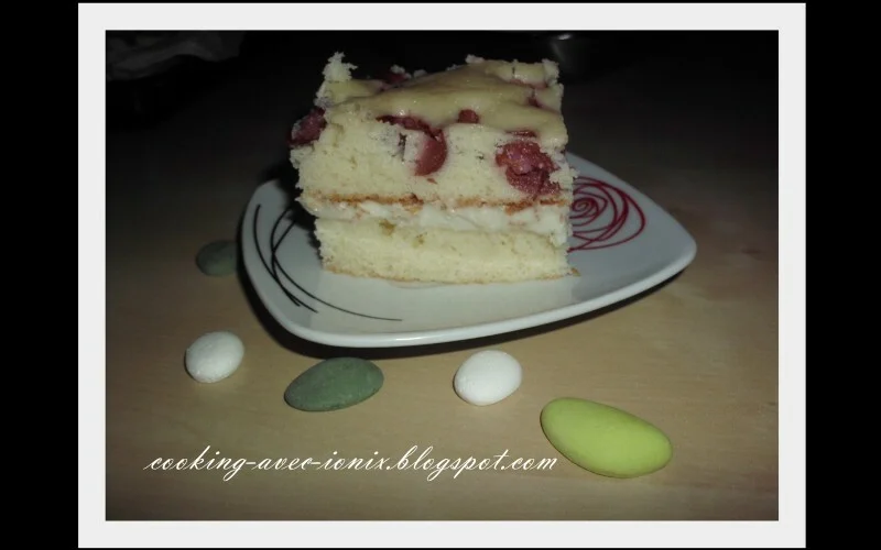 Yogurt cake with cherries and vanilla cream