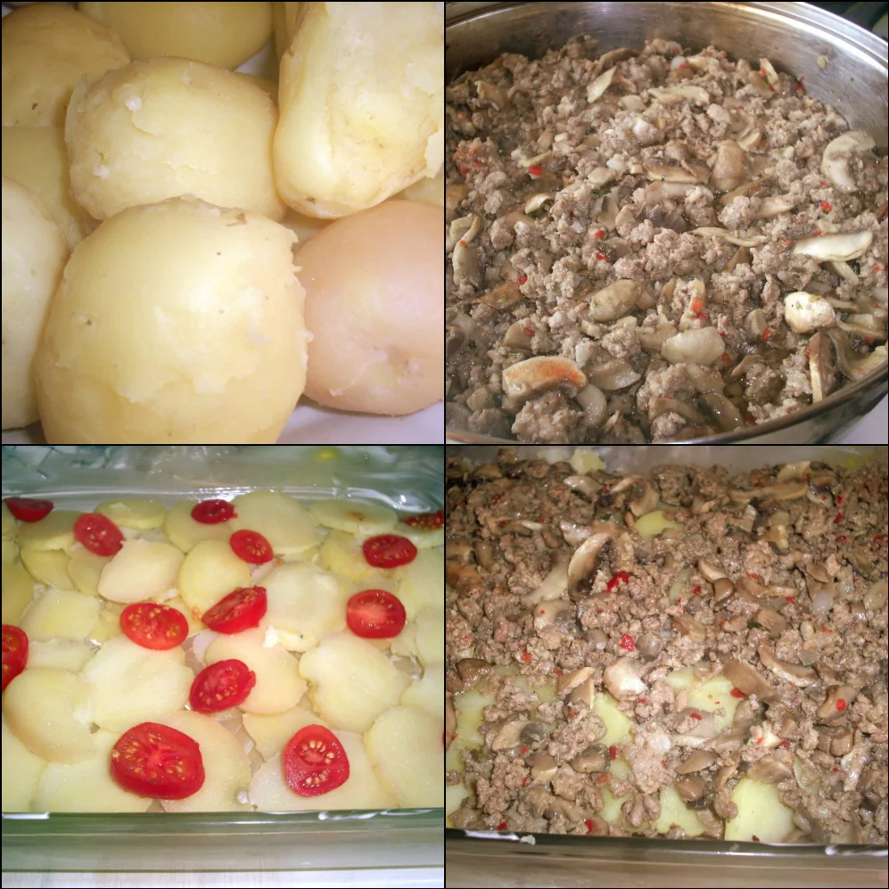Potato moussaka with meat and mushrooms