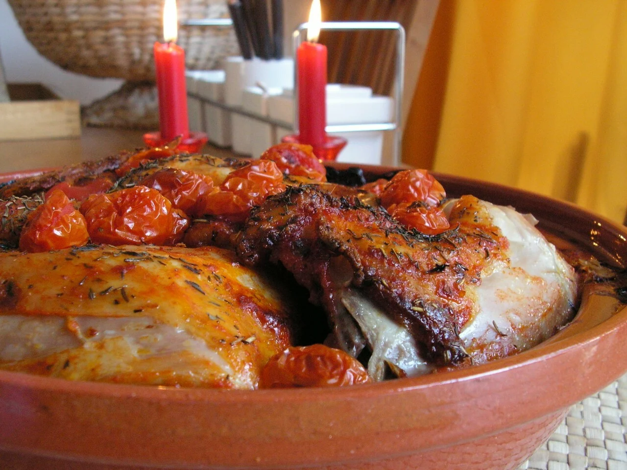 -… EN: View full recipe: Chicken steak with potatoes and cherry tomatoes in a wine sauce with rosemary and thyme in a clay pot, tajine