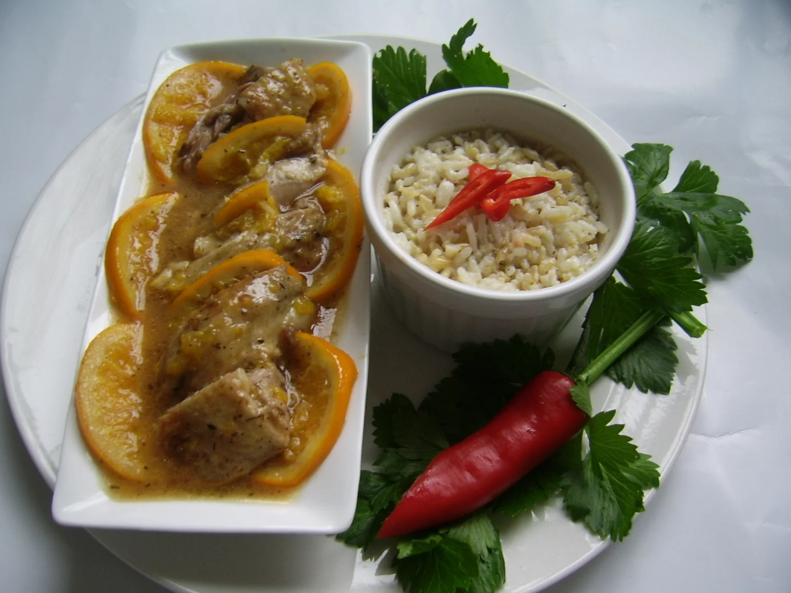 Duck breast with orange sauce and side dish of rice with Philadelphia cheese and leek