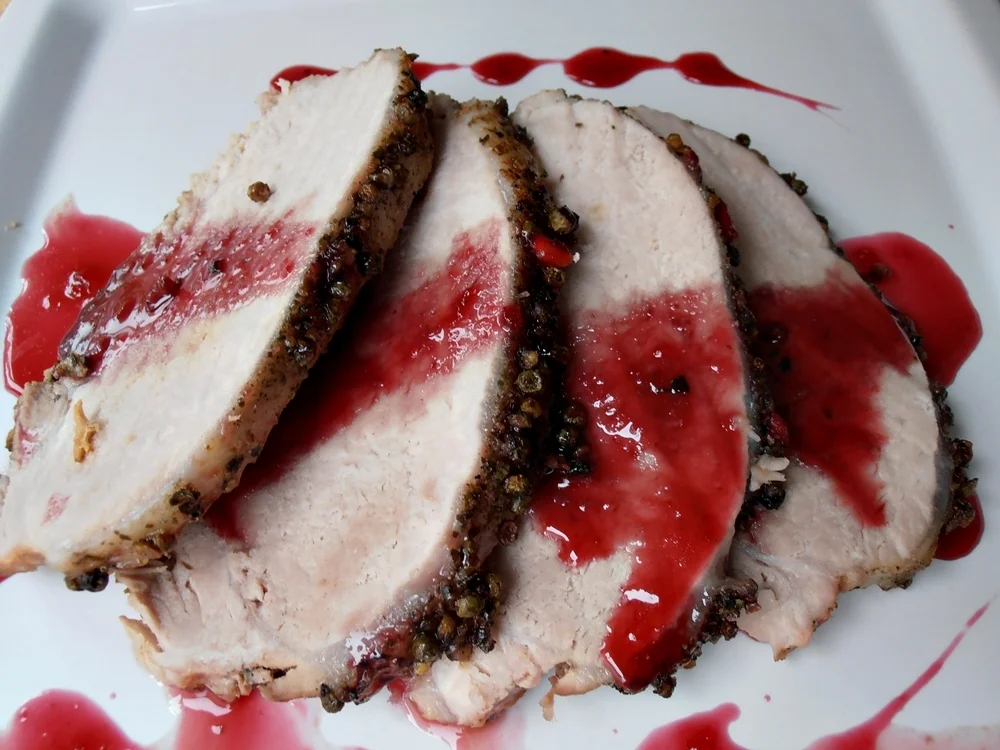 Cotlet de Porc în Crustă de Piper Verde cu Sos de Rodii