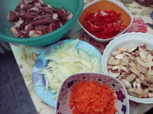 • Beef steak with potatoes in red sauce, baked