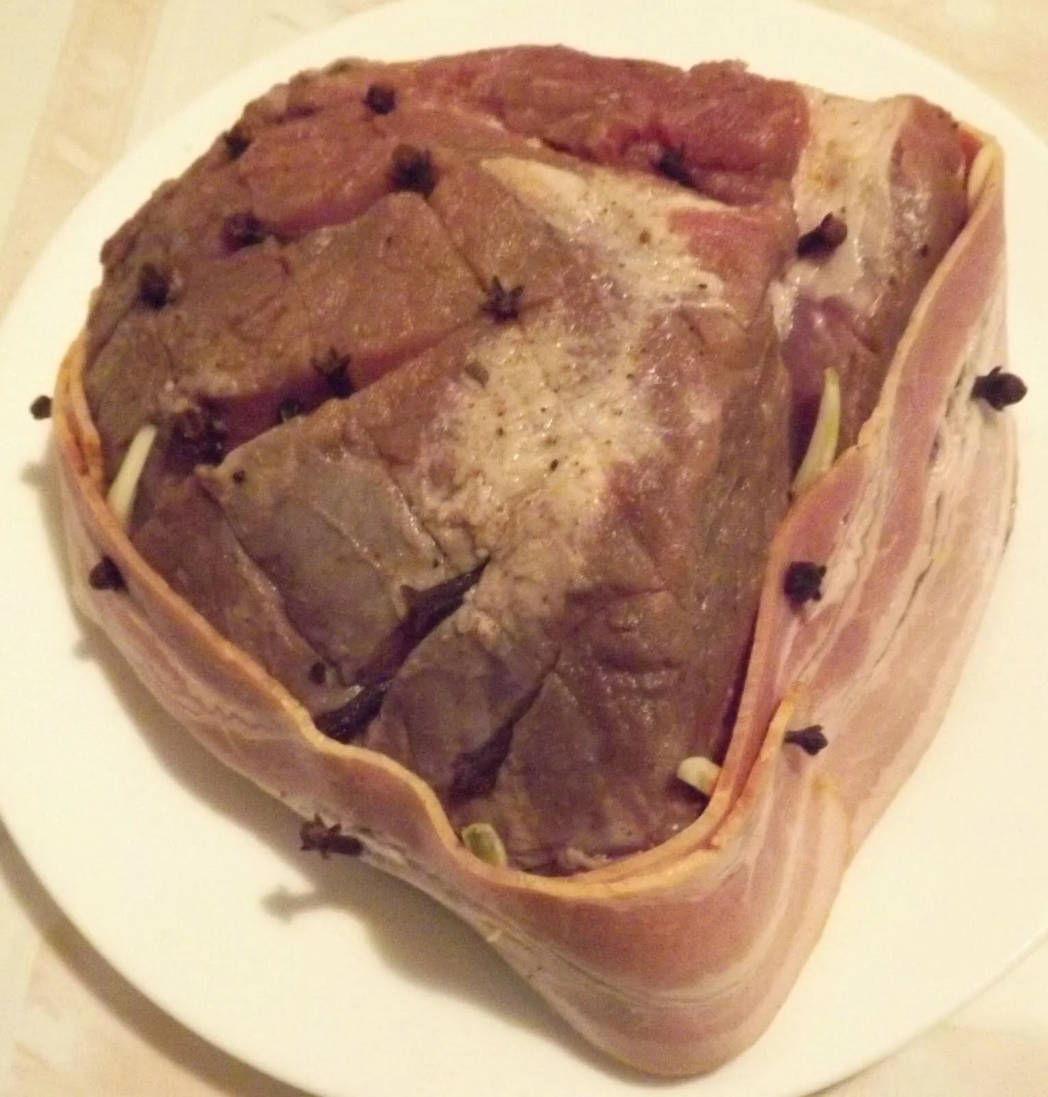 Delicious recipe for pork neck stuffed with garlic and cloves, served with a side of soldier potatoes and vegetable sauce