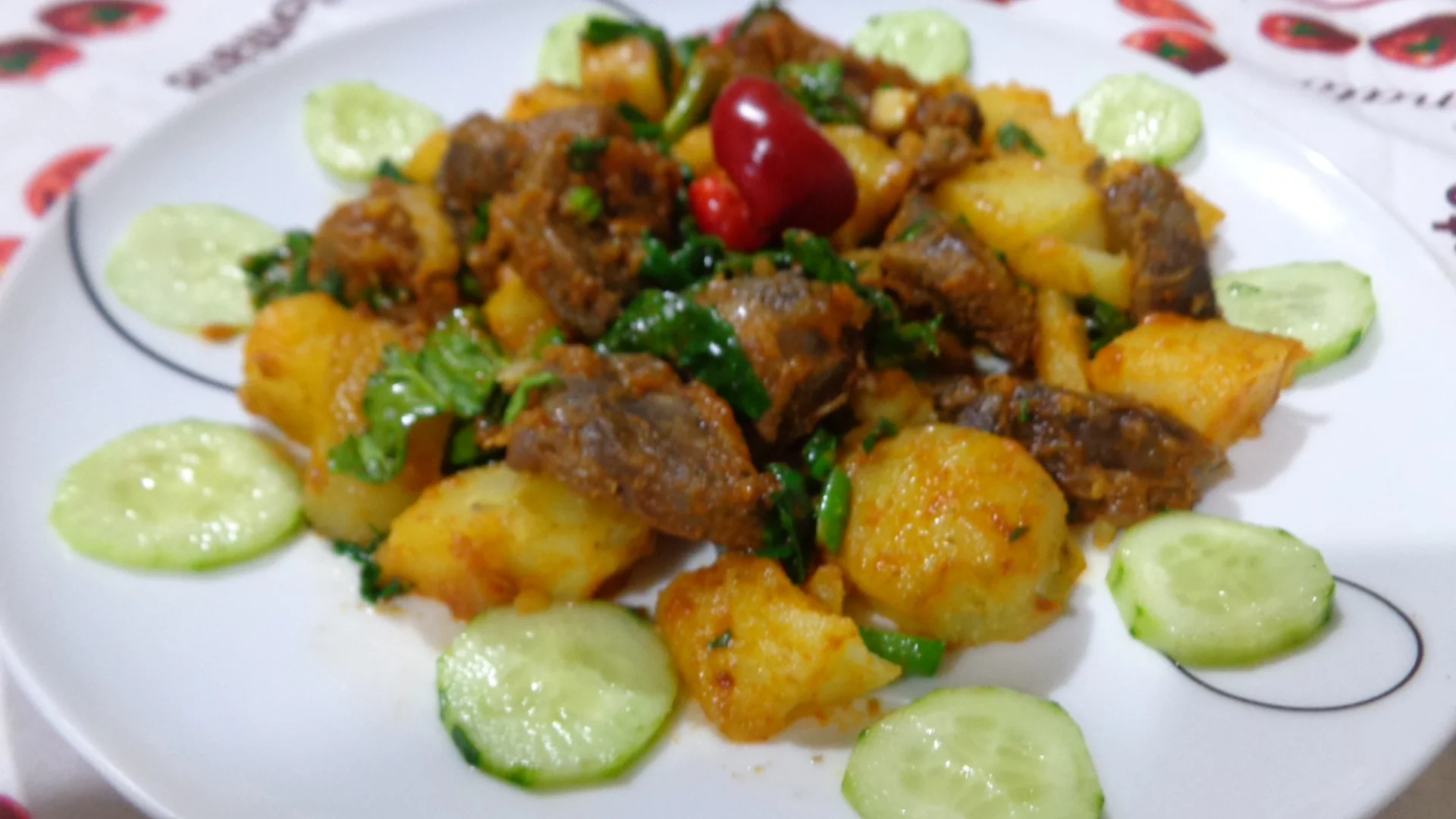 Beef stew with potatoes and spinach