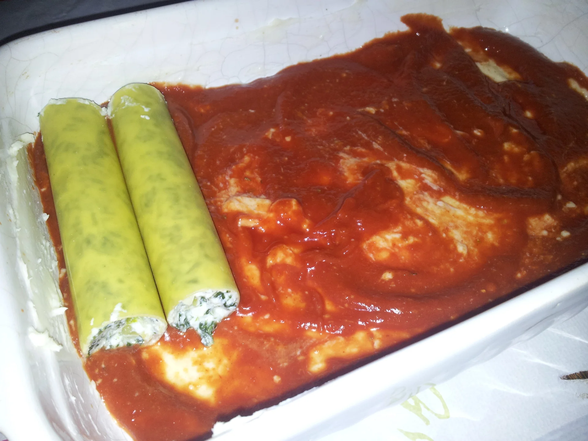 Cannelloni with Spinach, Ricotta, Tomato Sauce, and Bechamel Sauce