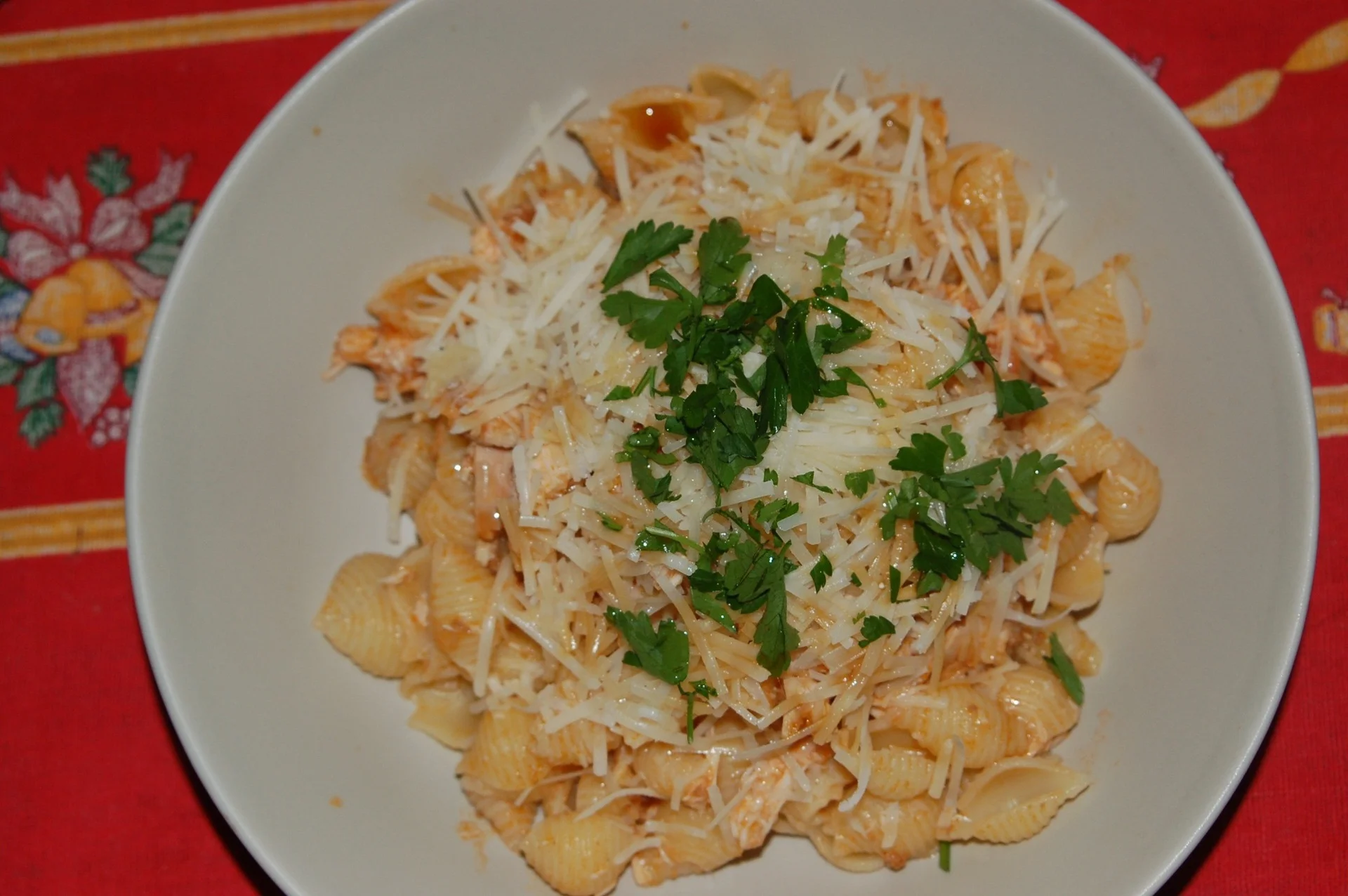 Shell Pasta with Chicken Breast, Tomato Sauce, and Parmesan