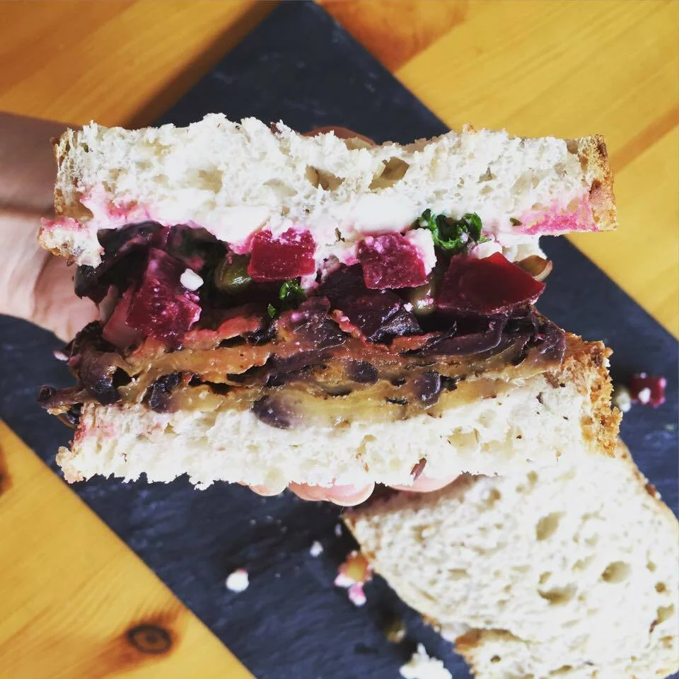 Vegetarian Sandwich with Eggplant, Beetroot Salad, and Feta Cheese