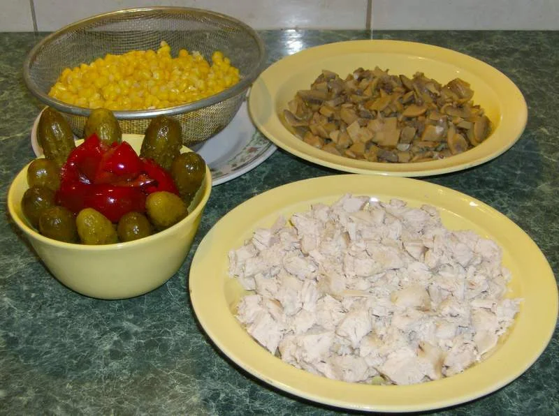 chicken breast salad corn mayonnaise mushrooms pickled cucumbers