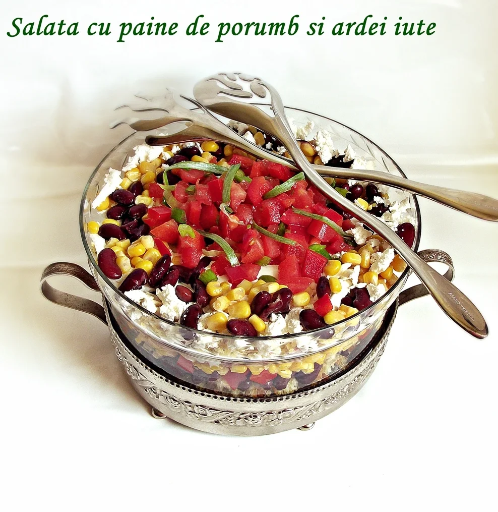 RO: Salata cu paine de porumb si ardei iute.ES: Ensalada de pan de maíz y pimiento picante.FR: Salade de pain de maïs et de piment fort.DE: Salat mit Maisbrot und scharfen Paprika.IT: Insalata di pane di mais e peperoncino.PL: Sałatka z chlebem kukurydzianym i ostrą papryką.PT: Salada de pão de milho e pimenta picante.TR: Mısır ekmeği ve acı biber salatası.EL: Σαλάτα με ψωμί καλαμποκιού και καυτερή πιπεριά.RU: Салат с кукурузным хлебом и острым перцем.ZH: 玉米面包和辣椒沙拉。JA: コーンブレッドと辛い唐辛子のサラダ。HI: मकई की रोटी और तीखे मिर्च का सलाद।