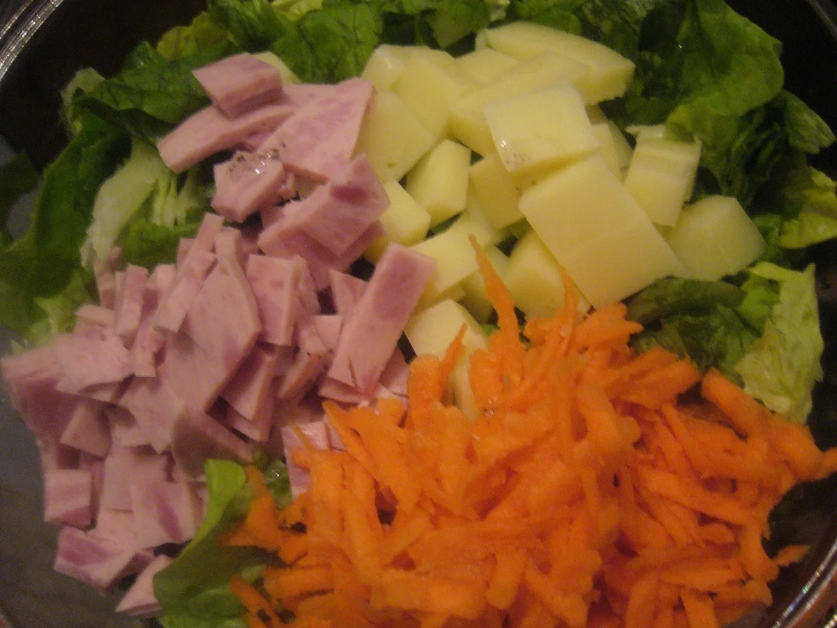 Fresh salad with carrot, cheese, and salami