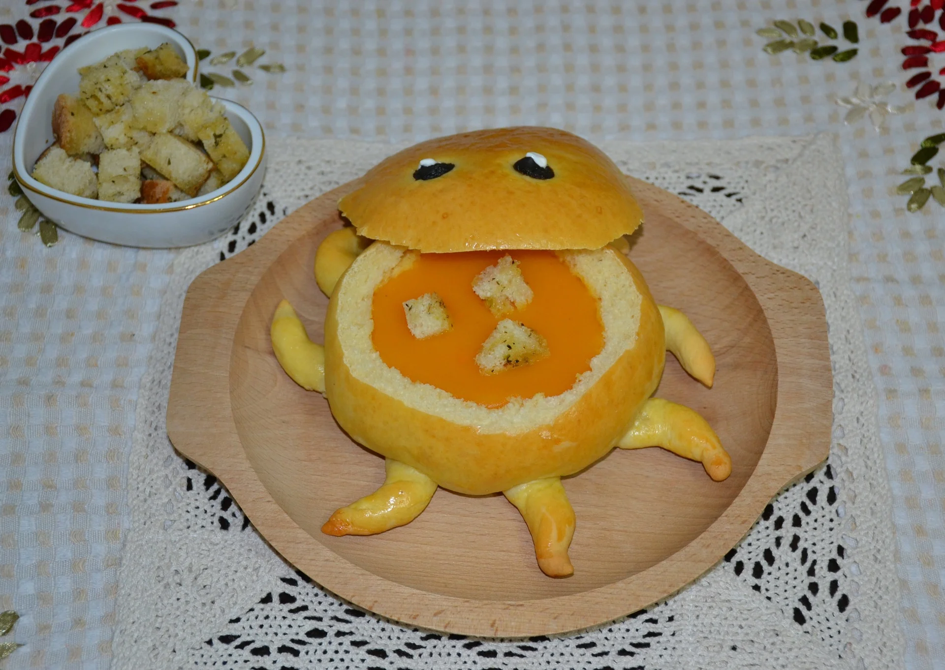 Total time: 1… EN: View full recipe: Pumpkin cream soup served in bread